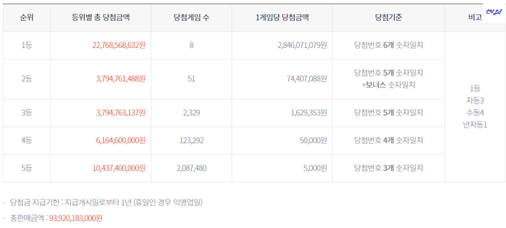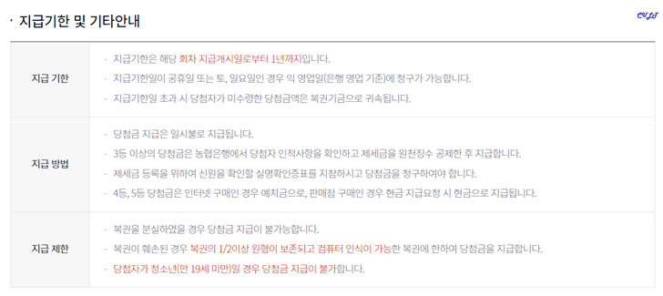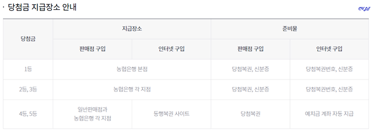 이밖에도 해당 페이지에서는 로또 1등부터 5등까지의 당첨금 지급장소 및 준비물도 확인해 보실 수 있습니다. 1등만 농협은행 본점 이고 2,3등은 농협은행 각 지점 4,5등은 일반 판매점 및 농협은행 각 지점에서 수령이 가능하다고 하네요.