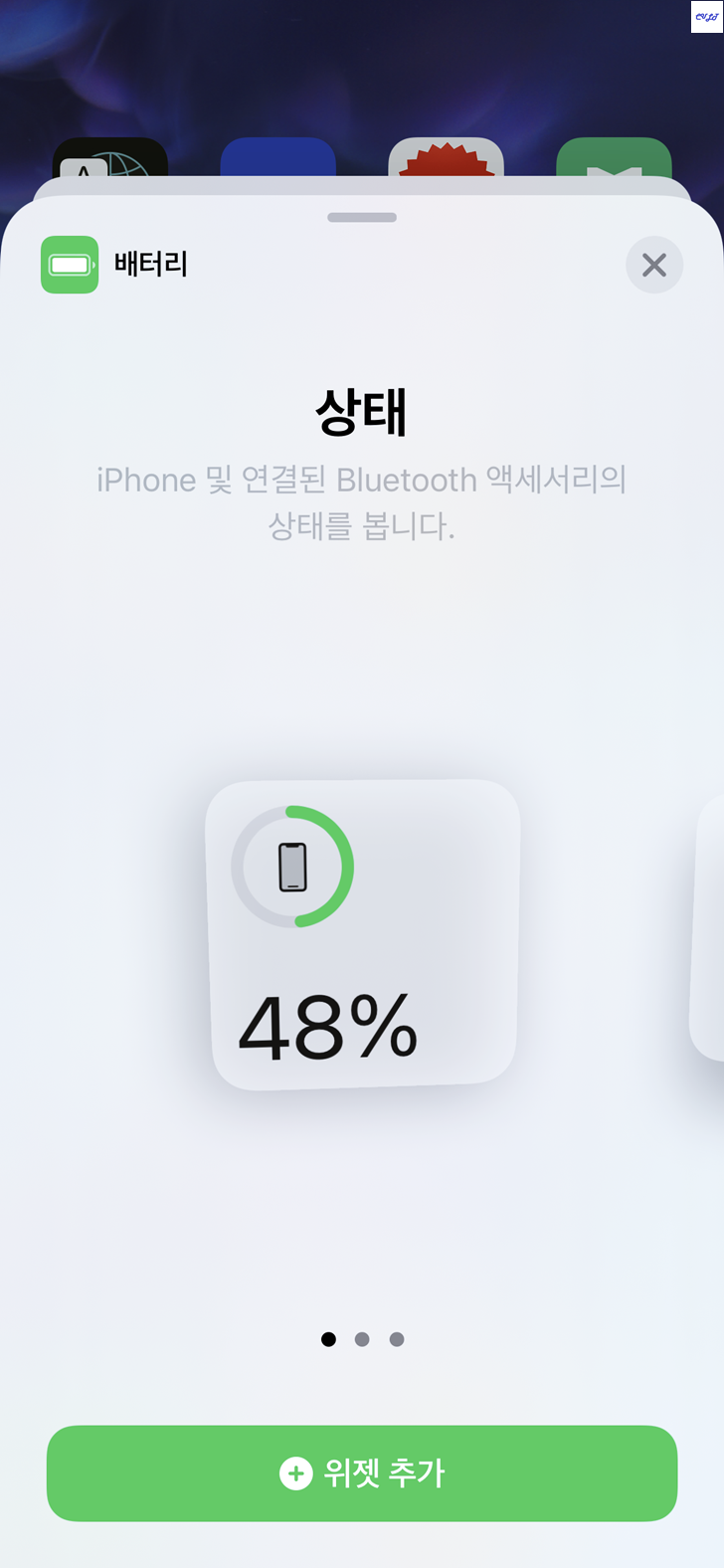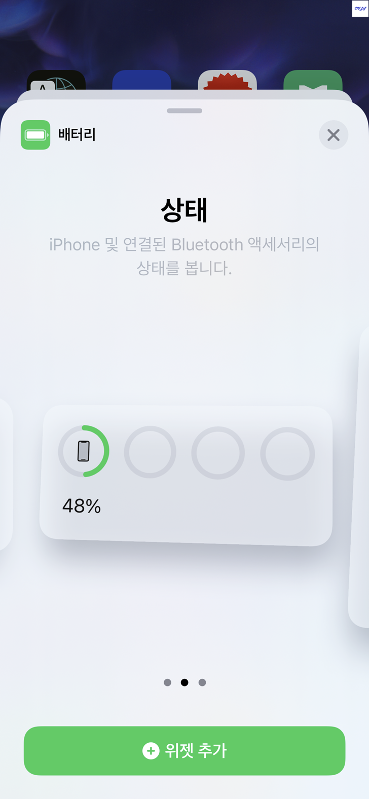 저는 이중에서 가로로 긴 사이즈의 위젯을 가장 추천 하는데, 그 이유는 총 4가지의 아이폰과 연결된 기기들의 배터리 잔량까지 동시에 모두 확인해 볼 수 있으면서 가장 슬림한 공간을 차지하기 때문입니다. 그럼 원하시는 위젯화면에서 하단 위쳇 추가 버튼을 선택해 줍니다.