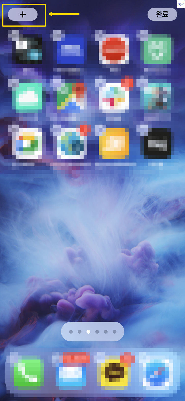그럼 아래와 같이 바탕화면 편집모드로 변경되는 것을 보실 수 있습니다. 여기서 우리는 좌측 상단 + 아이콘을 선택해 주도록 합니다.