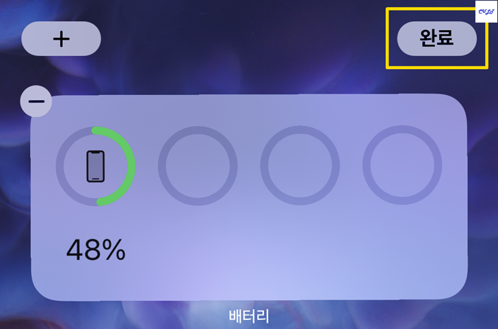 그럼 아래와 같이 내 배경화면에 배터리를 즉시 확인할 수 있는 영역이 생성된 것을 보실 수 있습니다. 여기서 우측 상단 완료 버튼만 선택 해 주시면 모든 과정이 마무리가 됩니다.
