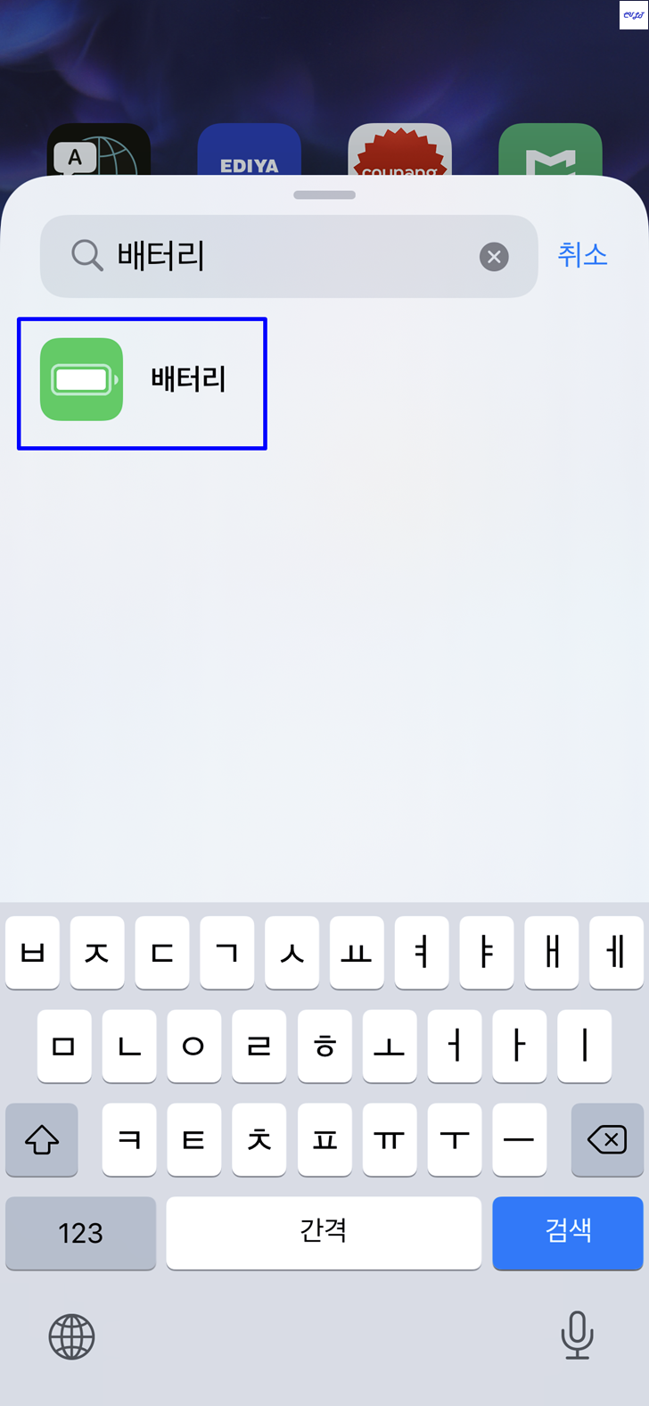 키패드가 상단으로 올라왔다면, 배터리 라는 키워드로 검색을 해주신 뒤 노출되는 배터리 아이콘을 선택해 주도록 합니다.